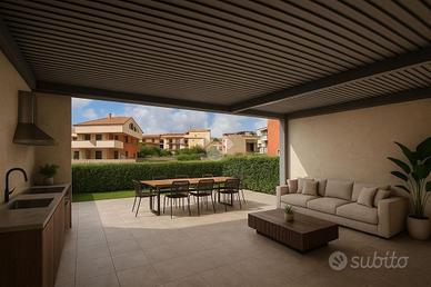 La soluzione si presenta con ingresso autonomo, predisponendo di un ampio spazio esterno ed un annesso terreno.