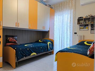 Camera matrimoniale servita da bagno in camera con box doccia e balconcino; cameretta con accesso a un ripostiglio e uscita su ampio balcone; bagno patronale con vasca.