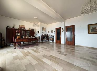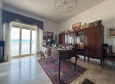A destra, il luminoso soggiorno doppio affaccia sullo Stretto di Messina, con doppia uscita sul balcone panoramico