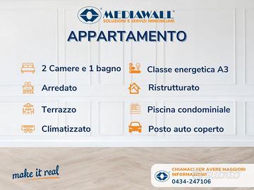 (Riferimento: BR-219-RV) Bibione (Rif. BR-219-RV) PALAZZINA COMPLETAMENTE RIQUALIFICATA CON SUPERBONUS 110% | APPARTAMENTO BICAMERE COMPLETAMENTE ARREDATO E RISTRUTTURATO | 3° ED ULTIMO PIANO CON ASCENSORE | CLIMATIZZATORE IN POMPA DI CALORE | SERRAMENTI IN DOPPIO VETRO ANTA/RIBALTA IN PVC | POSTO AUTO COPERTO | TERRAZZO | PISCINA CONDOMINIALE CON AMPIO SOLARIUM | PANNELLI FOTOVOLTAICI CONDOMINIALI. CLASSE ENERGETICA "A3". NOSTRA NUOVA ESCLUSIVA - Proponiamo in vendita in bellissima palazzina completamente riqualificata con superbonus 110% (tinteggiatura esterna, tetto e grondaie appena sostituite, installazione di pannelli fotovoltaici condominiali, rifacimento terrazzo e sostituzione di tutti gli infissi in doppio vetro anta/ribalta in PVC) a circa 900mt dal mare, quest'interessantissimo e luminoso appartamento bicamere, posto al 3° ed ultimo piano (con ascensore), completamente ristrutturato ed arredato. L'appartamento ha un'ottima esposizione e metratura interna (circa 60mq) ed è così composto: ingresso, ampia zona cucina/soggiorno open-space con terrazzo abitabile accessoriato di tenda da sole, disimpegno, ampia camera da letto matrimoniale, cameretta e bagno finestrato con box doccia completamente ristrutturato. Completa la proprietà il posto auto coperto (possibilità di parcheggiare auto + scooter) A servizio della palazzina è presente un curatissimo giardino condominiale ed un'ampia piscina con solarium. Dotazioni: serramenti doppio vetro anta/ribalta in PVC, climatizzatore in pompa di calore, rifacimento totale degli impianti elettrici ed idraulici, ristrutturazione del bagno, sostituzione della pavimentazione ed arredamento nuovo. Spese condominiali di € 1.200- comprensive di: pulizia scale, luce scale, amministratore, assicurazione dello stabile, giardinaggio, piscina ed acqua fredda! L'APPARTAMENTO NON NECESSITA DI ALCUN LAVORO! ACQUA FREDDA DISPONIBILE TUTTO L'ANNO! Contattaci e programma il s