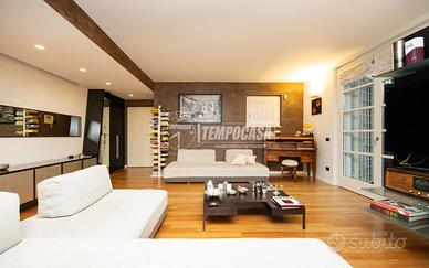 L'ingresso conduce all'ampia zona giorno, composta da un grande soggiorno impreziosito da eleganti finiture, tra cui stucco decorativo marrone e bianco, illuminato da importanti elementi di design come il lampadario Swarovski e le iconiche lampade Artemide Pirce, dal design scultoreo a spirale in alluminio bianco, oltre alla suggestiva lampada Mercury con sfere luminose. Nel soggiorno è inoltre presente un comodo armadio a muro realizzato su misura.