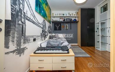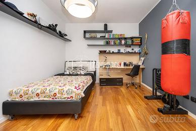 La zona notte, ben separata, ospita tre camere da letto, tutte dotate di armadiature su misura, oltre a due bagni, di cui un finestrato, completamente ristrutturati nel 2023, con sostituzione di tutti i sanitari e finiture moderne.