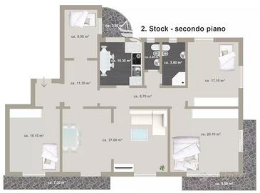 L'appartamento si presenta ampio e funzionale e dispone di un soggiorno, una cucina separata, quattro camere da letto, un bagno, un WC di servizio e 3 balconi che offre uno spazio esterno aggiuntivo.