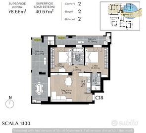 Appartamento piano quinto composto: soggiorno pranzo con cucina a vista, 2 camera da letto, 2 bagni, 2 balconi e posto auto di proprietà.