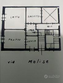 Via Molise. Soluzione ad angolo con piano cantinato/garage. 100mq circa: zona giorno, cucinotto, 2 camere da letto, bagno. Doppia esposizione. In buone condizioni. Per info/visite solo al No messaggi/mail