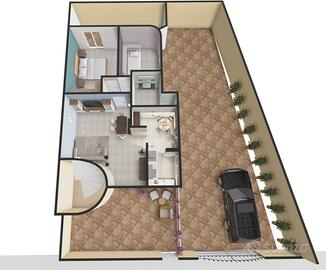 Area cortile privata di 25 mq da cui si accede alla zona soggiorno con cucina separata, nella zona notte: due camere da letto spaziose e luminose, e un bagno finestrato.
