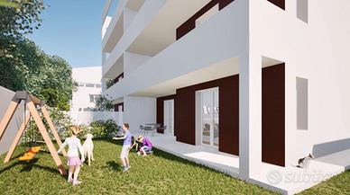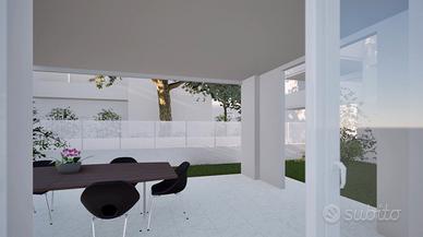 Al piano terra, questo elegante appartamento, con tripla esposizione, si distingue per l'architettura moderna e i materiali di alta qualità. Si compone di un ampio soggiorno ed una cucina abitabile e separata, entrambe con affaccio su un porticato di oltre 35 mq. Tramite disimpegno si accede alla zona notte, la quale comprende tre camere da letto, una delle quali con bagno en-suite e cabina armadio; bagno principale, lavanderia ed un secondo porticato di circa 20 mq.