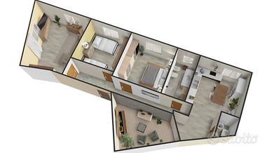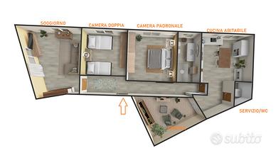 Soggiorno, cucina separata, due camere da letto, bagno, servizio;