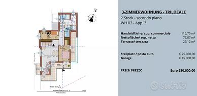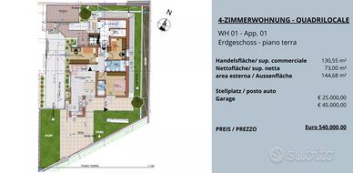 Rf.Nr: A322 A Pineta di Laives prende vita un esclusivo progetto residenziale composto da sole tre unità abitative. Situato in una zona particolarmente tranquilla e immersa nel verde, l'edificio rappresenta la soluzione ideale per chi desidera vivere in un contesto riservato e lontano dal traffico cittadino, senza rinunciare alla comodità dei principali servizi e collegamenti. Sono disponibili due appartamenti: un spazioso quadrilocali e un confortevole trilocale, pensati per offrire il massimo del comfort abitativo in un ambiente accogliente e ben curato. Consegna è prevista per Settembre 2026 (Vedi planimetrie) Riscaldamento: gas a pavimento Garage: € 45.000 Posto auto: € 25.000 Al fine di tutelare la privacy, precisiamo che gli indirizzi presenti negli annunci sono puramente indicativi. Per visionare l'immobile o ricevere ulteriori informazioni siamo a disposizione! Questo immobile in vendita viene proposto dall'agenzia immobiliare HOME IMMOBILIARE. Siamo specializzati nella compravendita d'immobili in tutto l'Alto Adige, i nostri punti di forza sono soprattutto la trasparenza e la professionalità. Inoltre, accompagniamo ogni cliente dalla proposta d'acquisto fino all'atto notarile. Siamo inoltre lieti di valutare la Vostra proprietà gratuitamente, in modo che tu sappia esattamente quale prezzo puoi ottenere.