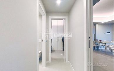 Internamente si sviluppa in un ingresso open space con cucina a vista e penisola, una camera da letto matrimoniale con balcone, una camera singola ricavata da un ampio ripostiglio, una cabina armadi e due bagni.