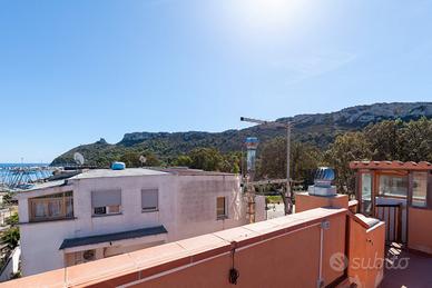 Una scala a chiocciola conduce alla terrazza sovrastante panoramica e privata, da cui lo sguardo abbraccia la Sella del Diavolo, il mare e lo stagno di Molentargius -- uno spettacolo che accompagna ogni tramonto.