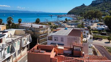 Una scala a chiocciola conduce alla terrazza sovrastante panoramica e privata, da cui lo sguardo abbraccia la Sella del Diavolo, il mare e lo stagno di Molentargius -- uno spettacolo che accompagna ogni tramonto.