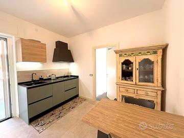 In vendita porzione di bifamiliare orizzontale al piano rialzato, composta da ingresso in luminosa sala, cucina separata, due camere, un bagno e un terrazzo con accesso diretto al giardino. Nel giardino troviamo un fabbricato adibito a garage. Una scala interna conduce al piano semiinterrato con taverna, secondo bagno, cantina, e un secondo accesso pedonale sul fianco della casa, offrendo due ingressi indipendenti. L'immobile è stato completamente ristrutturato con materiali di pregio e viene venduto arredato con mobili di valore.