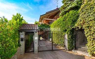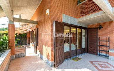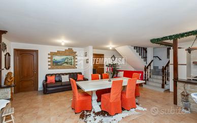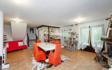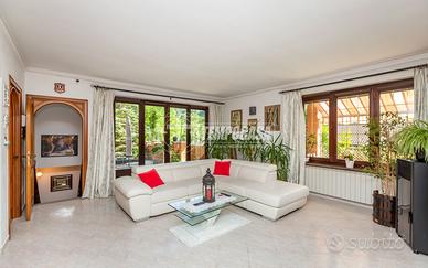 Tramite scala interna si accede al piano padronale, dove troviamo un ampio soggiorno con vetrata a tripla battuta e portafinestra a quadrupla che garantiscono massima luminosità e affaccio diretto sul giardino. La cucina abitabile, anch'essa con uscita sul giardino, completa la zona giorno.
