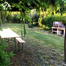 Secondo piano: ampia camera matrimoniale, bagno con doccia, seconda camera matrimoniale da dove si accede ad una camera mansardata. Ottime rifiniture con travi in legno, cotto e piastrelle di ceramica lavorati a mano, luminoso. Completa la proprietà due comodissime cantine ed un giardino staccato di 240mq con gazebo, barbecue e fontanella