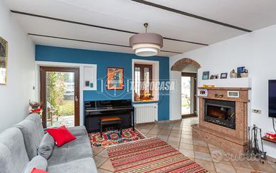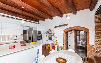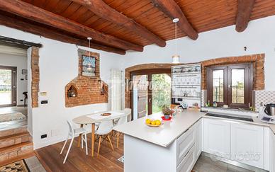 In posizione tranquilla ma a soli 8 minuti di auto dal centro di Gassino, proponiamo in vendita una suggestiva porzione di casa d'epoca, edificata nel 1885 e completamente ristrutturata con cura e attenzione ai dettagli. La proprietà dispone di un'area esterna perfettamente sfruttabile, organizzata in due zone: una dedicata ai posti auto, l'altra adibita a giardino privato, collegato direttamente all'abitazione e dotato di tre accessi indipendenti -- due tramite il portico della facciata principale e uno dal lato della casa. All'interno, il piano terra accoglie un'ampia cucina abitabile, dalla quale si raggiungono il bagno (dotato di ventilazione forzata) e la scala che conduce a una spaziosa cantina restaurata, mantenendo intatto il fascino dell'epoca. Completano il piano la sala da pranzo e il soggiorno, impreziosito da un camino con inserto ventilato capace di riscaldare entrambi gli ambienti. Dal soggiorno si accede inoltre a un pratico locale tecnico/lavanderia, dove sono collocati: attacchi lavanderia, lavatoio, centralina dell'impianto fotovoltaico con batteria di accumulo, serbatoio dei pannelli solari e caldaia. Dal medesimo ambiente parte la scala che conduce al piano superiore. Al primo piano troviamo un disimpegno, due ampie camere da letto, uno studio e un secondo bagno. Tutti i locali sono serviti da balconi con vista aperta sulla collina e sull'arco alpino. Un ulteriore disimpegno dà accesso alla cabina armadio e alla scala che porta al sottotetto completamente rifinito, ideale come ambiente jolly. L'intervento di ristrutturazione ha saputo coniugare autenticità e comfort, valorizzando i mattoni a vista, le travi in legno e gli elementi storici originari, migliorando nel contempo l'efficienza energetica grazie all'installazione di pannelli solari e fotovoltaico da 6 kW con batterie di accumulo da 10 kW complessi