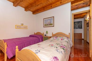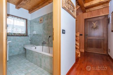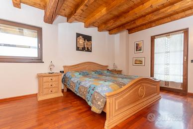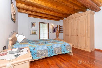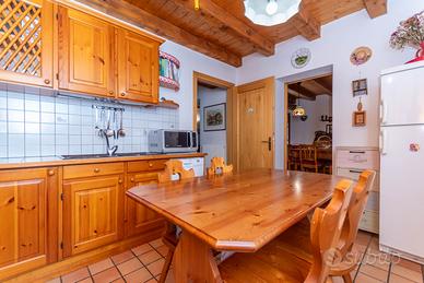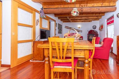 La porzione consiste nei 3 piani in legno, l'ingresso è indipendente al primo piano, con accesso diretto alla zona giorno della casa, troviamo il soggiorno, con il suo tavolo da pranzo e le bellissime travi a vista, la cucina abitabile, entrambi con accesso all'ampio ballatoio esterno, il bagno con vasca.