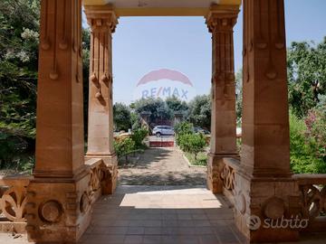 Varcato il cancello adornato da due colonne scoltpite entriamo nel giardino che circonda la villa, esso ci accoglie con il suo profumo di fiori e latmosfera serena, creando un contesto perfetto per momenti di relax allaperto. Accediamo a questa meraviglia attraverso un portico colonnato, adornato con colonne scolpite da un abile artigiano locale, Camillo Bagorda