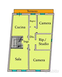 L'appartamento (LIBERO SUBITO) ha entrata dal 1 piano ma si sviluppa interamente al secondo piano con scala interna d'ingresso ed è composto da soggiorno, cucina abitabile con camino ed accesso al terrazzo, camera matrimoniale, camera media, bagno ed ampio ripostiglio / studio finestrato di 10 mq (eventualmente sfruttabile come terza camera). Inoltre soffitta/sottotetto accessibile con scala retrattile ideale come ripostiglio.