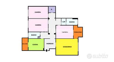 Ingresso, Ampia Sala di oltre 20 mq dotata di un Terrazzino comunicante con una delle 4 Camere, Cucina abitabile anch'essa con balcone, 3 Camere da letto, Doppi servizi entrambi con finestra, Un comodo Ripostiglio.