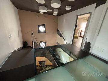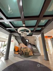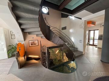 Una scala di design a vista, con solai in ferro e vetro, collega armoniosamente tutti i livelli dell'abitazione.