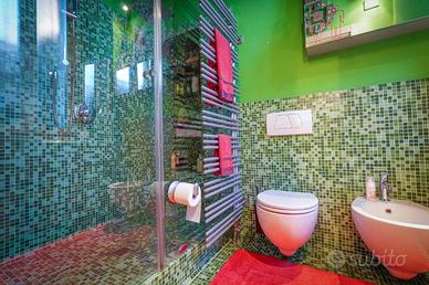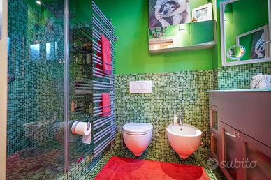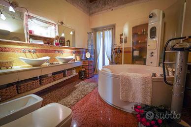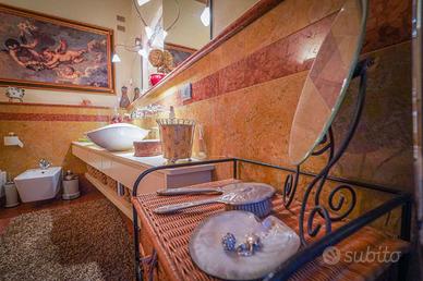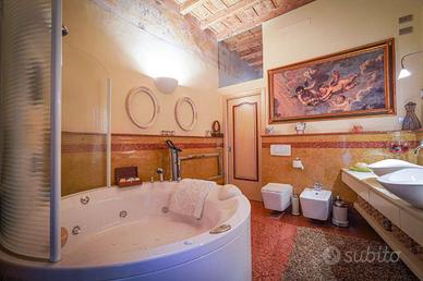 Dall'elegante porta scorrevole si accede alla sala da bagno con la vasca idromassaggio centrale, lavabi doppi e nicchie con incisioni storiche.
