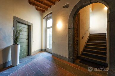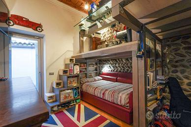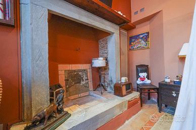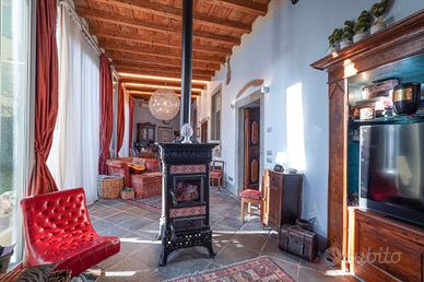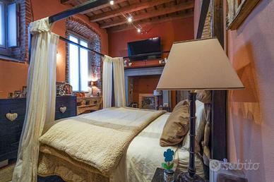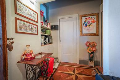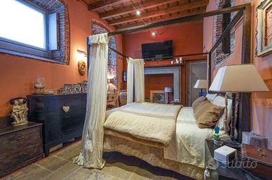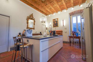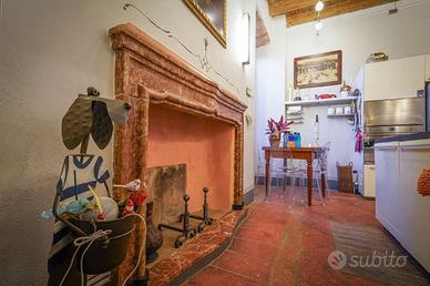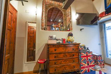 In tutto l'appartamento abbiamo i richiami d'epoca: il soffitto con le travi a vista, i pavimenti in cotto originale, gli affreschi e le porte originali d'epoca, fatte restaurare dalla proprietaria. Nessun dettaglio è stato lasciato a caso.