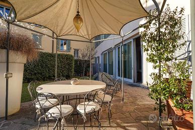 Le grandi vetrate regalano una luminosità agli interni e una vista sul giardino privato con il gazebo.