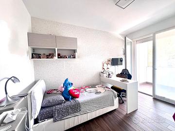 Completa la zona giorno un magnifico terrazzo di 90 mq, ideale per pranzi all'aperto, momenti di relax e intrattenimento. La zona notte dispone di due ampi balconi, che assicurano luminosità e sfogo esterno a tutte le camere.
