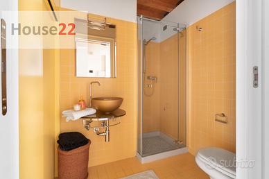 Il secondo bagno della casa offre pratiche soluzioni con doccia e angolo lavanderia nascosto.