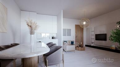 Il soggiorno con angolo cottura -- 26 mq ben distribuiti -- si apre su una terrazza esposta a sud di oltre 11 mq: il cuore della casa, dove il confine tra interno ed esterno scompare. Qui la luce è piena, il silenzio è reale, grazie agli infissi in doppio vetro camera che isolano acusticamente e termicamente, e si aprono anche a vasistas e microventilazione per lasciar entrare solo ciò che vuoi.