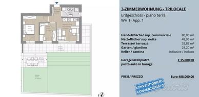 Ogni appartamento dispone di una luminosa zona giorno con cucina a vista, due camere da letto, un bagno funzionale e un'ampia terrazza con accesso diretto al giardino privato - uno spazio prezioso per rilassarsi all'aria aperta. Una spaziosa cantina offre ulteriore spazio di deposito. Ogni unità è completata da un posto auto in garage, acquistabile al prezzo di 35.000 €.