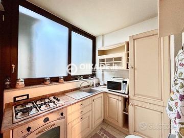 L'appartamento si apre su un luminoso soggiorno con angolo cottura, seguito da un