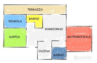 Ampio e luminoso soggiorno con angolo cottura e accesso alla terrazza, due bagni, tre camere da letto di cui una con bagno privato.