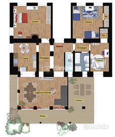 Ingresso in disimpegno che conduce a tutte le stanze, VERANDA DI 27 mq adibita a SOGGIORNO con accesso al PORTICO di 25 mq e CUCINA ABITABILE.