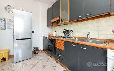 L'appartamento si apre su un comodo disimpegno che conduce al luminoso soggiorno, alla cucina abitabile con accesso diretto al balcone e al primo bagno finestrato.