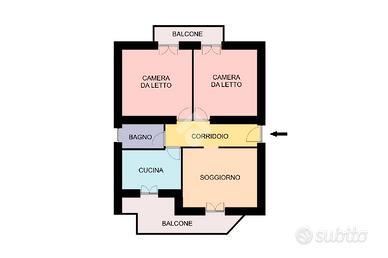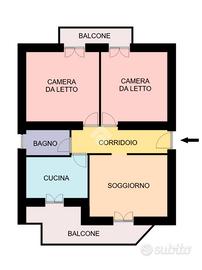 Un ampio soggiorno a vista affaccia su un balcone comune anche all'adiacente cucina abitabile: due camere da letto ampie e luminose occupano, invece, l'ala opposta della casa. Un bagno finestrato con doccia completa la casa.