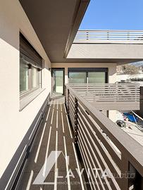 L'appartamento si compone di un ampio ingresso che conduce, tramite corridoio, alla zona giorno con cucina e soggiorno, con accesso diretto a un ampio terrazzo di 31 mq. La zona notte comprende una camera matrimoniale, due camere singole, di cui una con accesso al balcone e al giardino di 25mq, un bagno e un bagno-WC.