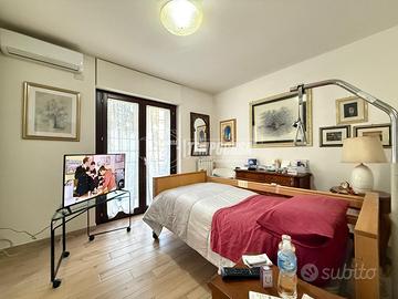Al primo livello, entrando nell'appartamento, ci accoglie un ampio e luminoso salone open space con cucina a vista in stile americano. La zona living è spaziosa e ben illuminata, con ampie vetrate che offrono una vista sul giardino pavimentato di 50 mq, perfetto per creare un angolo di relax all'aperto, ideale per cene in terrazza o semplicemente per godersi il verde in tranquillità. Un disimpegno separa il soggiorno dalla prima camera da letto matrimoniale, completa questo livello un bagno finestrato, dotato di sanitari moderni e rifinito con materiali di alta qualità.