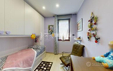 La zona notte si compone di una prima camera singola, luminosa e confortevole, e di una camera matrimoniale ampia e molto luminosa, con balcone privato che conferisce ulteriore ariosità e comfort. Completano la soluzione un pratico ripostiglio, una cantina al piano seminterrato e un box auto di proprietà.