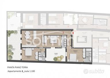 L'appartamento con codice 601, quadrilocale al piano terra, è composto da un ampio soggiorno con angolo cottura di circa 50 mq, tre camere matrimoniali ognuna con il proprio bagno privato, un cortile di circa 30 mq e un cortile interno di circa 20 mq.