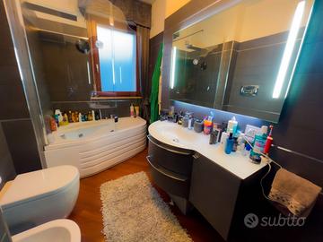 Tramite il disimpegno, accediamo alla zona notte composta dalla camera matrimoniale, dalla camera doppia, entrambe con veranda di pertinenza esclusiva, la comoda camera singola e dai due bagni, entrambi finestrati, di cui uno con ampio box doccia e uno con vasca idromassaggio.