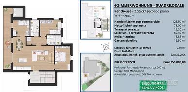Situato al secondo e ultimo piano, questo attico quadrilocale si distingue per spazi ben distribuiti e una posizione privilegiata. L'appartamento è composto da un soggiorno con angolo cottura, tre camere da letto, due bagni, una terrazza e un esclusivo solarium con accesso diretto dal soggiorno. A completare l'unità vi sono un giardino privato sopraelevato, una cantina, uno spazio per moto e biciclette, oltre alla possibilità di acquistare un posto auto su richiesta.