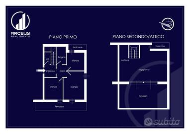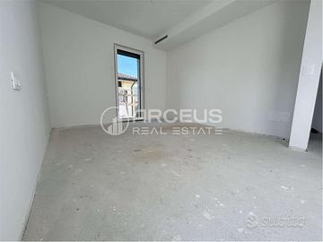 Lunità residenziale, esposta a Ovest/Sud/Est, si compone a primo piano: ingresso, disbrigo, tre stanze da letto due bagni (di cui uno finestrato), un balcone, una terrazza e scala per secondo; a piano secondo/attico: angolo cottura, soggiorno con accesso su terrazza di mq. 31.