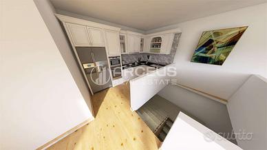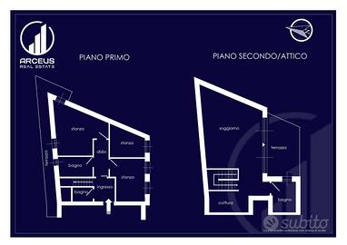 Lunità residenziale, esposta a Nord/Sud/Est, si compone a primo piano: ingresso, disbrigo, tre stanze da letto, due bagni (di cui uno finestrato), una terrazza e scala per secondo; a piano secondo/attico: angolo cottura, soggiorno con accesso su terrazza di mq. 13,30 e bagno finestrato.