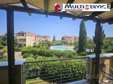 L'abitazione situata al piano primo offre ottimi spazi interni, un'ampia zona giorno openspace, con terrazza in affaccio su curato parco condominiale servito di piscina attrezzata e poggiolo, disimpegno, camera matrimoniale di mq. 16 collegata ad una seconda terrazza, cameretta con letto matrimoniale, doppi servizi di cui uno fornito di sauna per i vostri momenti di benessere. L'immobile viene venduto con annesso posto auto coperto al piano interrato, parzialmente arredato ed accessoriato di aria condizionata, zanzariere e cassaforte. Eu. 248.000,00