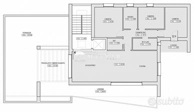 Ingresso, zona giorno di oltre 43 Mq con ampie vetrate, disimpegno, 3 camere da letto (camera matrimoniale, camera doppia con terrazza e camera singola) bagno, bagno/lavanderia e un ripostiglio. Terrazza su due lati di oltre 100 Mq. Al piano interrato 48 Mq. di garage da adibire anche ad area magazzino/ripostiglio.