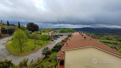 TORRITA DI SIENA (SI), alla quota di 567 m s.l.m. in località Montefollonico, vendesi appartamento al piano primo in fabbricato a schiera. Luminoso e panoramico. La superficie catastale complessiva commerciale dell'immobile è di mq 118 (in considerazione dell'appartamento di mq 104 e dell'autorimessa di mq 16 e della cantina/lavanderia di mq 12. Dispone di cantina/lavanderia e terrazze panoramiche. L'appartamento dispone di ingresso indipendente con resede privato per buona parte pavimentato, scala interna di collegamento che porta al primo piano ed al piano seminterrato (al piano terra insiste un altro appartamento di altra proprietà con accesso da tutt'altra parte); al primo piano dispone di ingresso, terrazzina panoramica, soggiorno, cucina/pranzo, pochi scalini a salire permettono l'accesso al reparto notte con camera matrimoniale con bagno con doccia e balcone, cameretta con balcone, bagno con vasca.