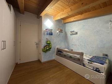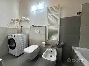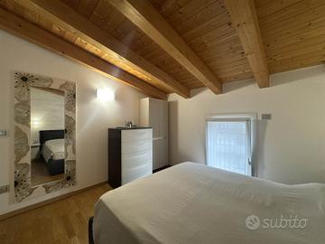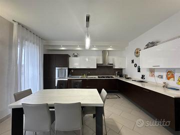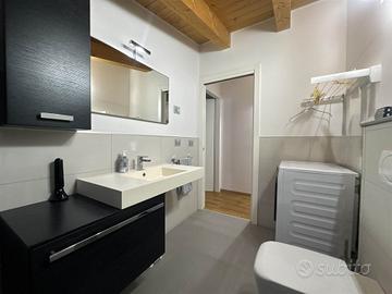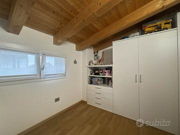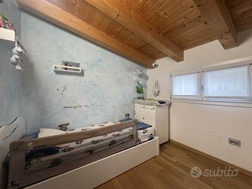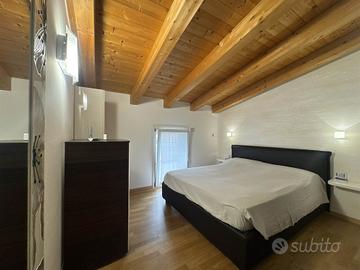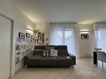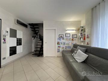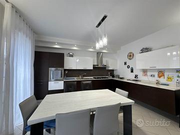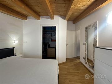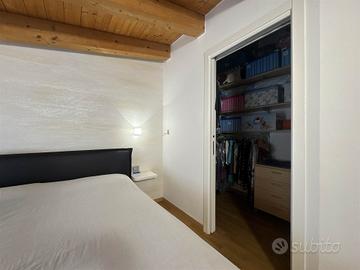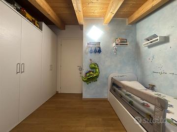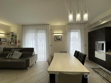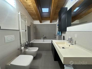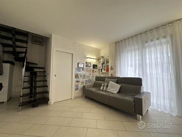 La disposizione su due livelli crea un'atmosfera accogliente e moderna, con una cucina a vista che si integra perfettamente con il soggiorno, ideale per momenti di convivialità. Le condizioni dell'immobile sono seminuove, con finiture di alta qualità e riscaldamento a pavimento, che assicurano un comfort ottimale in ogni stagione.