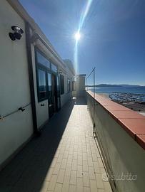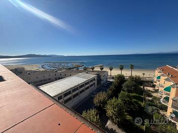 Vendesi bellissimo attico in zona centrale di Follonica. A pochi passi dal mare si propone in vendita ampio appartamento di circa 140 mq compreso le terrazze, al sesto ed ultimo piano con vista mozzafiato su tutto il golfo della città,da Punta Ala all'Isola D'elba che si può ammirare dal comodo terrazzo. All'interno troviamo spaziosa cucina con il terrazzo di servizio, soggiorno, due camere metrimonaili, camerina, piccolo studio e bagno finestrato con doccia. Immobile ristrutturato, mobilio nuovo, vendesi arredato, impianto elettrico nuovo del 2019. Termosingolo, No cantina, no garage. Ideale sia per la residenza sia per le vacanze.